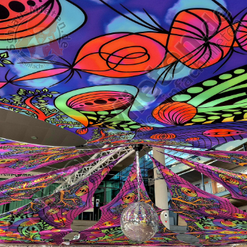 Dekotextil aus Polyester und Elastan für Traversenkonstruktionen & Pagodenzeltdächer | verschiedene Variationen aus Mustern und Farben, bei Schwarzlicht floureszierend