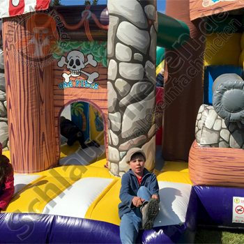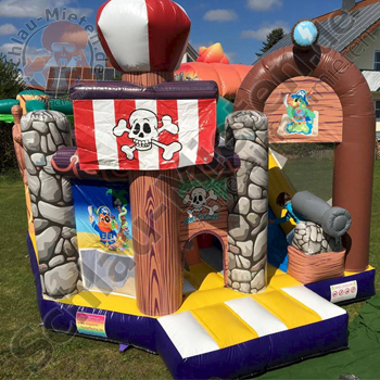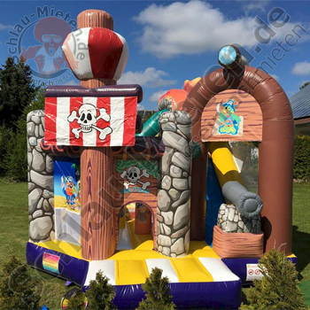 professionelle Hüpfburg mit Rutsche, Kletterwand zur Rutsche, Hindernissen und Hüpffläche mit  Piraten-elementen (Piratenflagge, Kanonoen, Schatzkiste, Palme, Steuerrad | inkl. Gebläße & Heringe