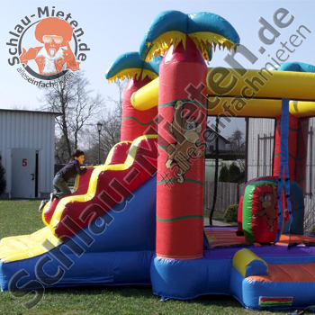 Klettere mit den kleinen freundlichen Affen durch unsere Dschungelburg, hüpfe zwischen den Palmen umher und rutsche dann nach draußen ins Freie!