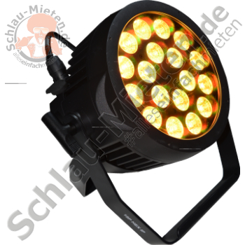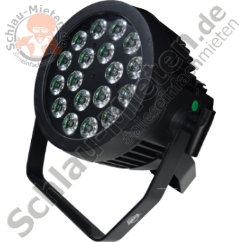 - Leuchtquelle: 18 x RGBAW + UV-LEDs (rot, grün, blau, amber, weiß und UV) mit je 12 Watt